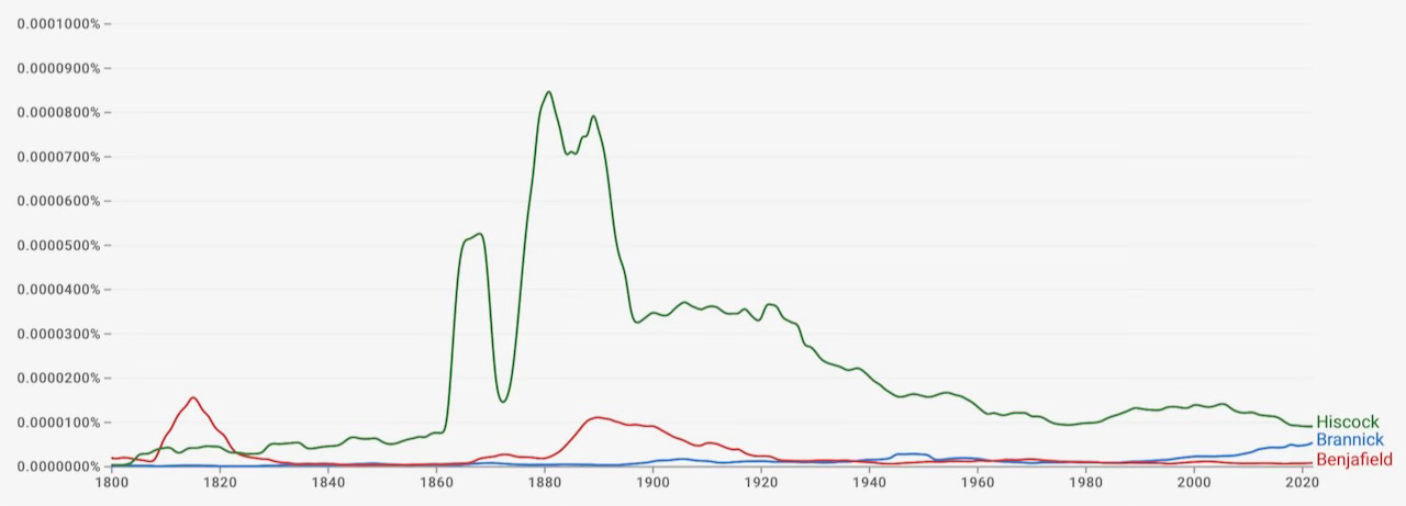 Google N-gram is a search engine that shows the frequency of any word in anything printed between 1500 and the present day, more or less. It’s an easy rabbit hole to tumble down - trust us, having checked the relative frequency of countless combinations of words or names (is Brannick, Benjafield or Hiscock more common in literature?).