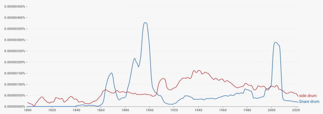 Last newsletter we shared the N-gram for drum kit / drum set. We’re not planning for this to be a regular feature, but given how often orchestral percussionists get asked the difference between a snare drum and a side drum (there is none), we thought you might like to see what’s more common.